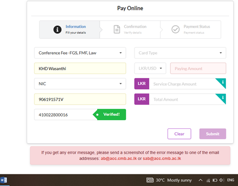 *If you get any error message while doing online payment, please send a screenshot of the same to ab@acc.cmb.ac.lk